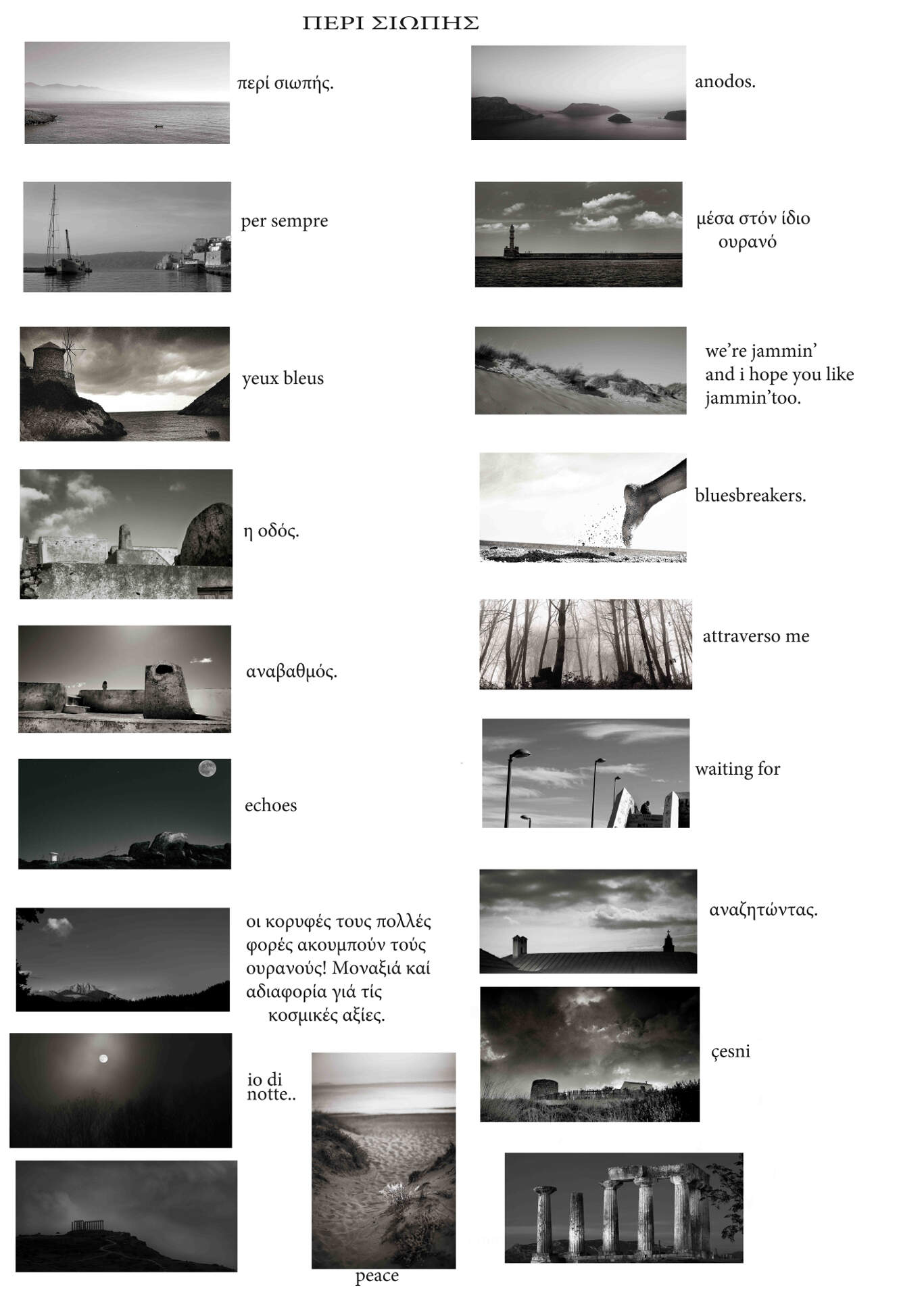 Ο τίτλος της έκθεσης είναι συμβολικός σε μια εποχή φλυαρίας. Σε μια εποχή, που περισσεύουν τα λόγια, η φωτογραφία μιλά με τη σιωπή της. Και αν έχει κάτι να πει η σιωπή της ειναι ηχηρή.