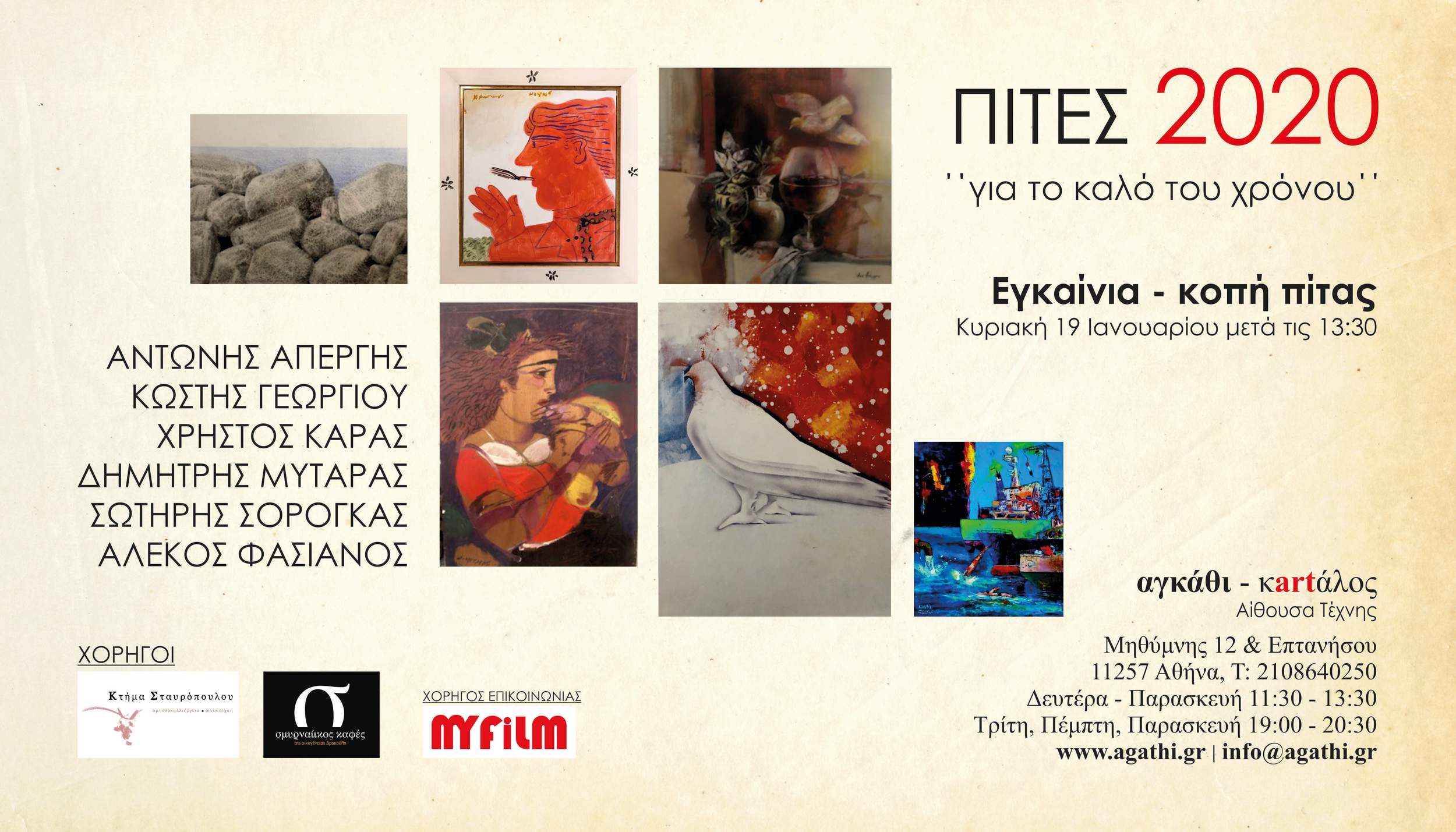 Παράλληλα, στα εγκαίνια θα κοπούν έξι πίτες για το καλό του χρόνου. Κάθε φλουράκι αντιστοιχεί σε ένα σπάνιο χαρακτικό ενός εκάστου των έξι καλλιτεχνών που συμμετέχουν στην έκθεση.
