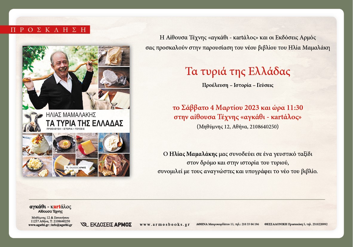 Παρουσίαση του νέου βιβλίου του Ηλία Μαμαλάκη «Τα τυριά της Ελλάδας» (Εκδόσεις Αρμός)